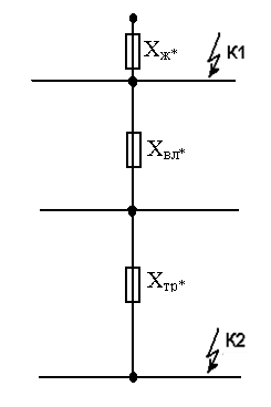 2.26 - сурет. Қысқаша тұйықтау тогын есептеуге арналған электрлік (а) және алмастыру сұлбасы (б)