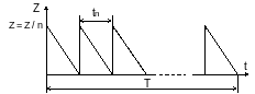 Полагается, что внутри интервала планирования Т поставка запчастей осуществляется партиями z=Z/n, где n - искомое количество поставок за время Т. Внутри каждого интервала tn между поставками расход запасных частей является линейной функцией времени (рис.2.4).
