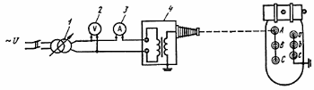 Испытывают поочередно изоляцию каждой обмотки. Испытания проводят по схеме (рис.3.25, где, 1 — регулировочный трансформатор; 2 — вольтметр; 3 —амперметр; 4 — повышающий трансформатор).