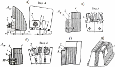 Рис.3.35.Эскизы отремонтированных сердечников с использованием сварки (а), дополнительных нажимных шайб с зубцами (б), отдельных нажимных пальцев (в) и клиньев (г), (д) эскиз зубца сердечника со вставкой.