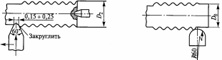 Электромеханический метод применяют для чистовой обработки поверхностей взамен шлифовки (чистота поверхности Ra = 0,63÷0,32), упрочнения поверхностного слоя на глубину 0,2—0,3 мм для повышения износостойкости и усталостной прочности, восстановления размера изношенной поверхности до 0,4 мм без добавления металла и свыше 0,4 мм с добавлением металла. Процесс состоит из двух операций –высадки поверхностного слоя изношенной поверхности (рис. 8.38, а) и сглаживания (рис. 8.38, б) до определенного размера. Высадкой достигается образование винтового выступа на поверхности детали диаметром D2. Стружка при этом не срезается, а происходит пластическая деформация поверхности слоя. Сглаживание производится радиусной пластиной до размера D0, при этом происходит повышение твердости поверхности на глубину до 0,15 мм.