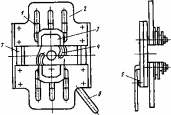 Листовой материал разрезают ручными или механизированными ножницами, а рулон–дисковыми. Катушечные группы наматывают на автоматизированных станках, предварительно устанавливая программу намотки и размер шаблона. После окончания намотки станок останавливают, щеки шаблона сближают, ослабляя намотку, для облегчения съема катушек. При работе на неавтоматизированных станках используют унифицированные шаблоны, рассчитанные для намотки катушек определенных размеров (рис.3.47, где 1 –рама; 2 –каретка; 3 –сменные головки; 4 –кулачки; 5 –фиксатор; 6 –ручка; 7. –направляющая; 8 –ступица; 9 –коромысло; 10 –кольцо алюминиевое; 11 –кольцо текстолитовое; 12 –рычаг; 13 –диск). Шаблоны позволяют наматывать равнокатушечную и концентрическую обмотки и имеют приспособление, позволяющее движением рукоятки ослабить намотку обмотки и свободно снять ее с шаблона.