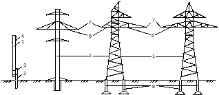 В качестве заземлителей на ВЛ всех напряжений следует в первую очередь использовать естественные заземлители (железобетонные фундаменты). При недостаточном сопротивлении естественных заземлителей устанавливаются искусственные заземлители 6 (рис.1.2.12,а). Присоединение заземляющего спуска деревянной опоры, стальной арматуры железобетонной опоры, тела металлической опоры к заземлителям выполняется заземляющим проводником 4. Заземляющий проводник соединяется с заземлителем сваркой 7, а с заземляющим спуском – сваркой или болтовым зажимом 5.