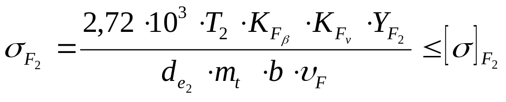 где Т2 – номинальный крутящий момент на валу конического колеса, Нм; de2, b и me (mte) – в мм; F=0,85 – прямозубые колёса; для колес с круговыми зубьями по табл. 2.5; YF2 – коэффициент, учитывающий форму зуба колеса, находят по табл. 2.10 с учётом коэффициента смещения инструмента; для прямозубого колеса – по эквивалентному числу колеса: