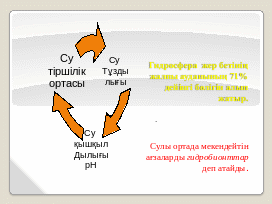 Су тіршілік ортасы. Гидросфера жер бетінің жалпы ауданының 71% дейінгі бөлігін алып жатыр. Сулы ортада мекендейтін ағзаларды гидробионттар деп атайды. Гидробионттардың экологиялық жіктелуі бойынша суда тіршілік ететін ағзалар нектон, планктон және бентос болып бөлінеді.