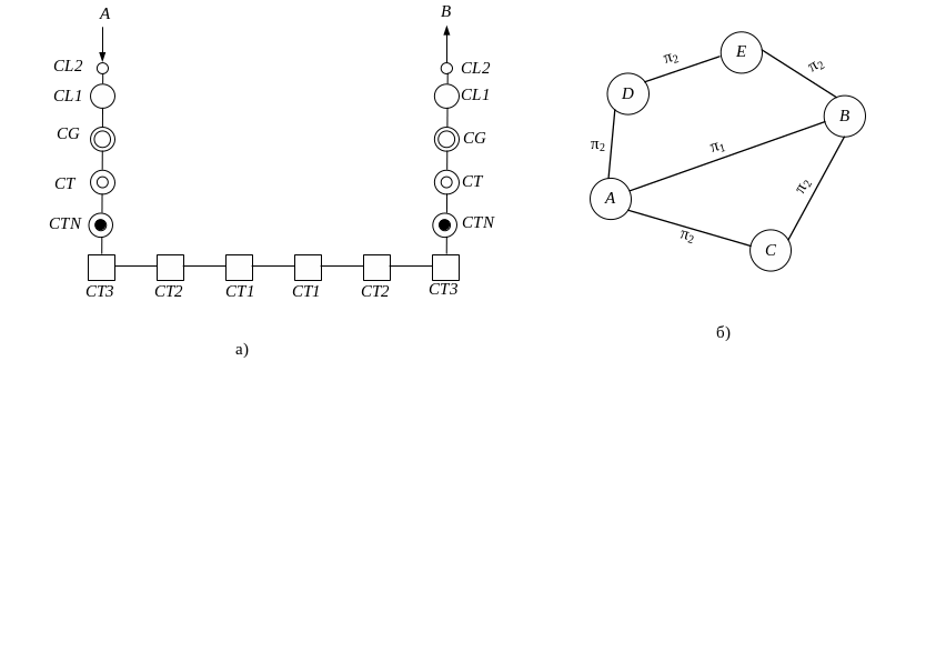 а) международная сеть; СТ 1, 2 и 3 — международные транзитные узлы 1; 2 и 3-й категорий, СТN — национальный транзитный узел, СG — узел зоны, СL 1,2 — местные узлы; б) иллюстрация обходных путей для сообщения между станциями A иB:путь первого выбора АВ, путь второго-выбора АСВ, путь третьего выбора ADEB, π1 и π2 — вероятности потери попытки на пучках.