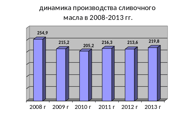 По официальным данным Федеральной службы государственной статистики, в 2013 г. был отмечен рост объемов выпуска сливочного масла российскими предприятиями. Объем производства составил 219,8 тыс. т продукции или 102,9 % к соответствующему периоду 2012 г. (рис. 1).
