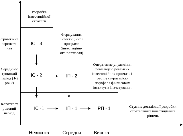 Як видно з наведеної схеми, розробка інвестиційної стратегії підприємства, хоча й орієнтована в основному на довгострокові цілі (квадрант ІС-3), включає також формування окремих стратегічних цільових нормативів і показників, які дають можливість приймати в наступних середньострокових і короткострокових періодах конкретні інвестиційні рішення по формуванню інвестиційної програми й інвестиційного портфеля (квадрант ІС-2), а також реалізації реальних інвестиційних проектів і реструктуризації портфеля фінансових інструментів інвестування (квадрант ІС-1).