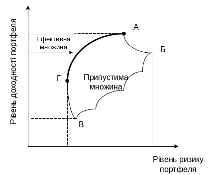 Беручи до уваги, що обидві ці вимоги в процесі визначення розташування ефективної множини повинні враховуватися в комплексі, всі варіанти портфелів, що задовольняють ці вимоги повинні розташовуватися на кривій між точками А і Г (тобто на лівій верхній границі припустимої множини). Тільки зі складу ефективних портфелів, що лежать на кривій ефективної множини, може бути обраний оптимальний варіант інвестиційного портфеля; всі інші варіанти портфелів є для інвестора неефективними портфелями, тобто вони повинні бути відкинуті.