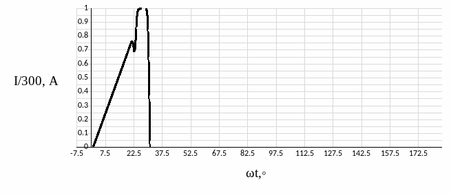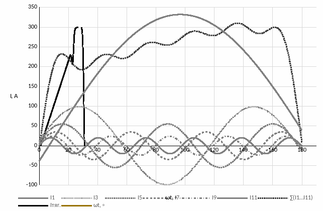 Разложим кривую тока на гармоники с кратностью к = 1, 3, 5, 7, 9, 11, для чего, по теореме Котельникова, участок оси абсцисс от 0 до 180 достаточно разделить на 12 равных частей.