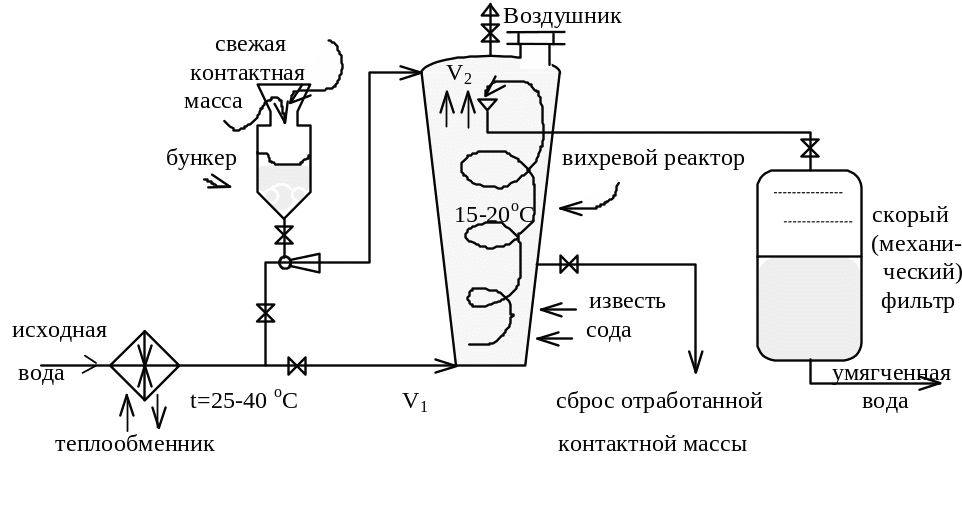 Исходная вода вводится в конический корпус аппарата по тангенциальному патрубку и взвешивает контактную среду (песчинки) в восходящем спиральном потоке. В вершину корпуса подается осветленная суспензия известкового молока. Умягченная вода отводится из верхней части корпуса. Корпус вихревого реактора имеет также люки для загрузки и выгрузки контактной среды.