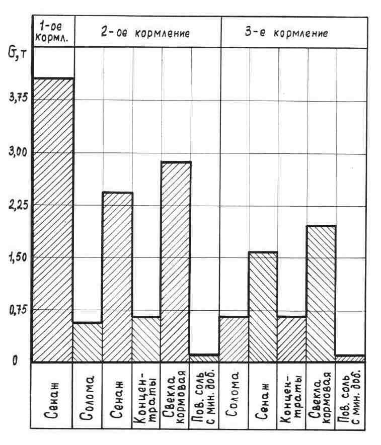 На фермах крупного рогатого скота корма раздаются три раза в сутки. Время кормления устанавливается: 1-ое кормление с 6 до 7 ч, 2-ое - с 13 до 14 ч, 3-е - с 19 до 20 ч.