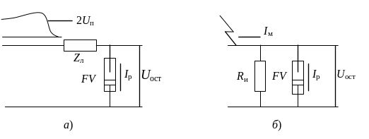 Если импульсный ток, протекающий через разрядник, превысит значение 5-14 кА, то остающееся напряжение на нем станет больше электрической прочности защищаемой изоляции. Величину импульсного тока разрядника можно приближенно определить на основании следующих схем (рис. 4.3).