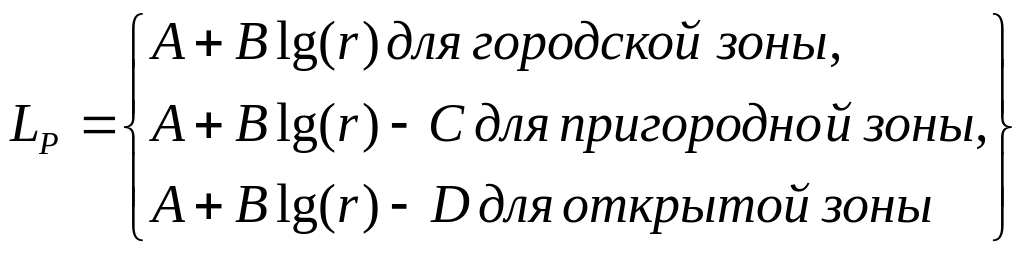 Существует достаточно большое количество эмпирических моделей предсказания потерь при распространении сигналов для различных типов местности. Наиболее известной и используемой является модель предсказания Окомура и Хата в случае изотропных (идеальных всенаправленных), имеющих коэффициенты усиления, равные 1, антенн базовой станции и подвижного объекта. Эта формула (метод прогнозирования Окомура) имеет следующий вид: