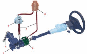 4 – рульова сошка; 5 – з’єднувальні шланги; 6 – бачок.