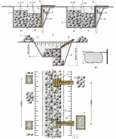 Рис. 1. Стрічковий фундамент: а, б – з бутового каменю під заливання; в, г – з бутобетону або бетону; д, е – під лопатку при глибині траншеї до 1,25 м і більше; ж – вибір каменів скобою; 1, 9 – траншеї з вертикальними і похилими стінками; 2 – щебінь; 3 – бут; 4 – цементно-піщаний розчин; 5 – опалубка; 6 – робочий настил; 7 – упор; 8 – підкладка; 10 – бутобетон; 11 – ящик для розчину; 12 – дерев'яний щит для прийому бутового каменю; 13 – жолоб для подачі буту; 14 – лоток для подачі розчину.