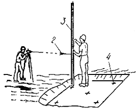 1 - нивелир; 2 - визирный луч; 3 - рейка; 4 - контролируемые точки