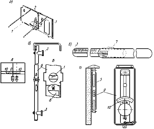 Рис.22. Контроль вертикальности (а) и специальные рейки: с уровнем (б), телескопическая (в), маятниковый отвес (г)