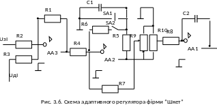 Адаптивний регулятор виконаний з незмінної частини – операційний підсилювач АА1, який має інтегральну характеристику, та змінної частини на операційному підсилювачі АА2. Крім того операційний підсилювач АА1 слугує суматором.