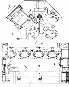 1 пробоины на стенках рубашки охлаждения или картера; 2 износ торцов первого коренного подшипника; 3 трещины и отколы; 4 износ нижнего посадочного отверстия под гильзу; 5 износ верхнего посадочного отверстия под гильзу; 6 износ отверстий под толкатели; 7 износ отверстий во втулках под опорные шейки распределительного вала;