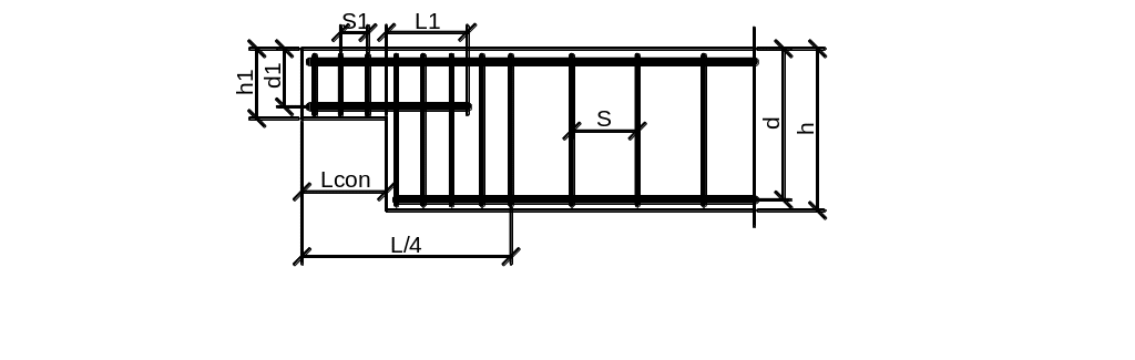 Так как в средних пролетах могут возникать значительные отрицательные моменты, для их восприятия по всей длине пролетов устанавливаются стержни 2 Æ12 S500.