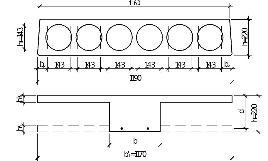 Поперечное сечение многопустотной плиты приводим к эквивалентному тавровому сечению. Заменяем круглые отверстия равновеликими по площади квадратами со стороной h1.