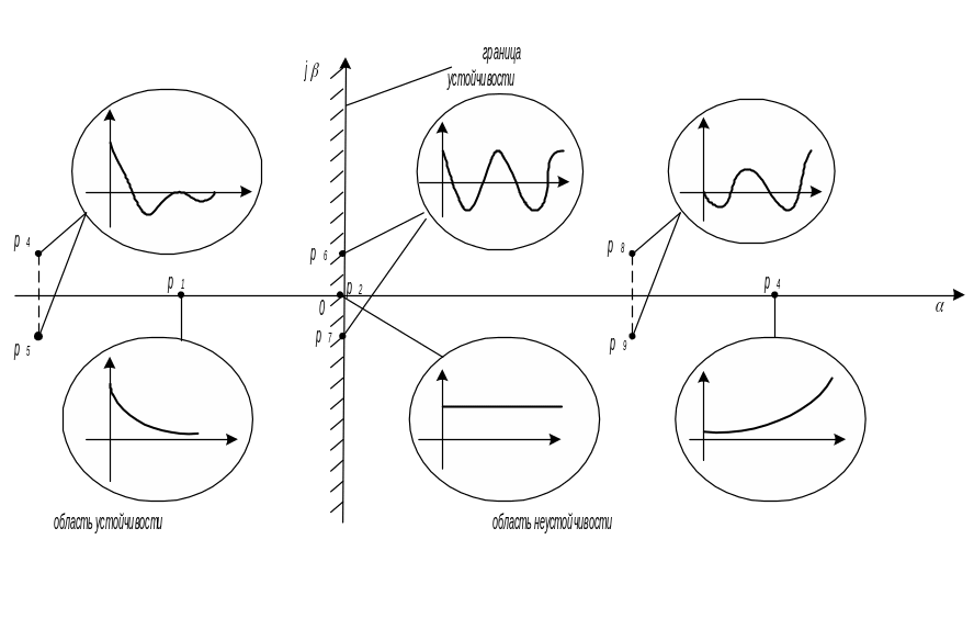 Мнимая ось j является границей устойчивости в плоскости корней. Если характеристическое уравнение имеет пару чисто мнимых корней (pk = +jk , pk+1 =- jk), а все остальные корни находятся в левой части комплексной плоскости, то в системе устанавливаются незатухающие гармонические колебания. В этом случае говорят, что система находится на колебательной границе устойчивости.