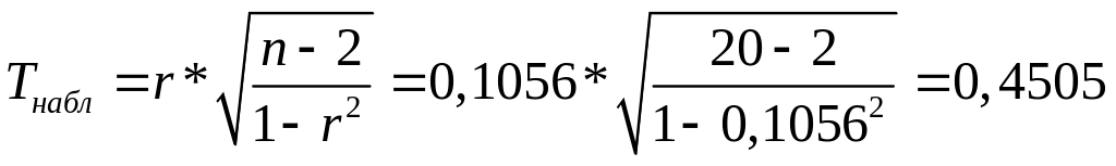Данные в корреляционной таблице представляют случайную выборку. Статистические числовые характеристики (Sх,Sy), полученные по этой выборке, являются оценками параметров генеральной совокупности, поэтому о тесноте зависимости между признаками X и Y мы судим по величине оценки коэффициента корреляции r. Следует проверить его значимость, т.е. установить – достаточна ли его величина при данном объеме выборки (n=20) для вывода о наличии корреляционной зависимости между признаками X и Y.