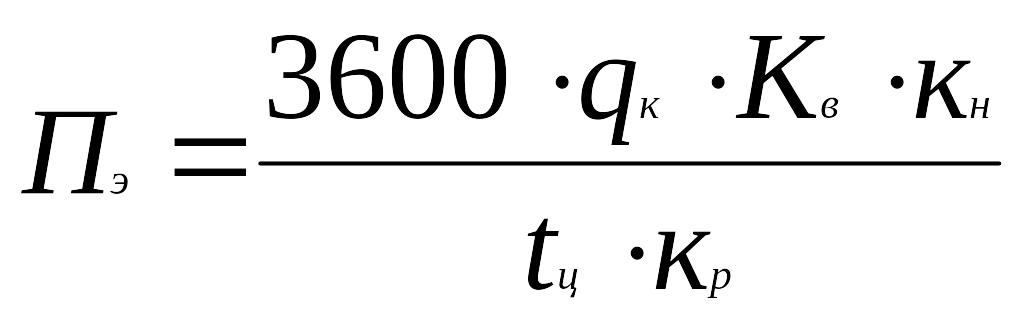 где qк – геометрическая вместимость ковша, м3; Кв – коэффициент использования рабочего времени; кн – коэффициент наполнения ковша (кн=0,5…1,2 в зависимости от вида грунта и использования толкача); tц – продолжительность цикла, с; кр – коэффициент разрыхления грунта (кр=1,0…1,3).