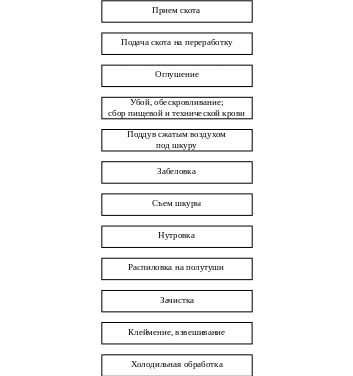 При разработке технологических диаграмм убоя скота и разделки туш следует опираться на установленную последовательность операций, рекомендуемых технологическими инструкциями переработки скота на предприятиях мясной промышленности (рисунки 1, 2).