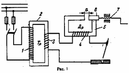 Магнитный контактор 3 служит для включения цепи спаренных электродов. В начальный момент при возбуждении дуги сварочная цепь замыкается через свариваемую деталь и один из электродов (на рисунке электрод 8). Ток проходит по обмотке 4 регулятора и обмотке 2 контактора. Контактор включает обмотку 5 регулятора. Возникает вторая дуга. При отводе электродов от детали ток в обмотках 4 и 2 прекращается и контактор 3 выключает цепь обмотки 5, гасит дугу между электродами.