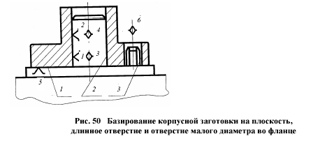 При изготовлении корпусных деталей призматического типа широко используется базирование по плоской поверхности 1 и двум отверстиям 2, чаще всего обработанным по 7 квалитету. Детали фланцевого типа базируются на торец фланца 1, отверстие 2 большего диаметра и отверстие 3 малого диаметра во фланце. Распределение опорных точек зависит от соотношения длины базирующей части отверстия к его диаметру. В мелкосерийном и единичном производствах обработку заготовок корпусных деталей выполняют на универсальных станках без приспособлений. Разметкой определяют положение осей основных отверстий, плоских и других поверхностей. Обработку плоских поверхностей можно производить различными методами на различных станках – строгальных, долбежных, фрезерных, протяжных, токарных, расточных, многоцелевых, шабровочных и др. (лезвийным инструментом); шлифовальных, полировальных, доводочных (абразивным инструментом).