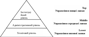 Та попри залежність від того, скільки існує ступенів управління, керівників розподіляють на три категорії з точки зору виконання функцій. Назви цих рівнів: технічний, адміністративний та рівень соціальних структур (інституційний) (рис. 1.2).