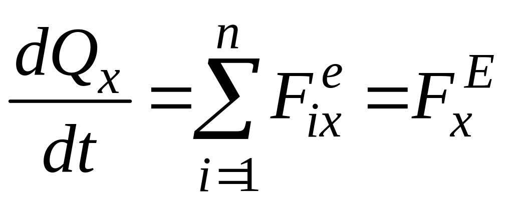 Отже, перша похідна за часом від проекції головного вектора кількості руху механічної системи на будь-яку вісь дорівнює алгебраїчній сумі проекцій зовнішніх сил, які діють на точки механічної системи, або проекції головного вектора зовнішніх сил на ту саму вісь.