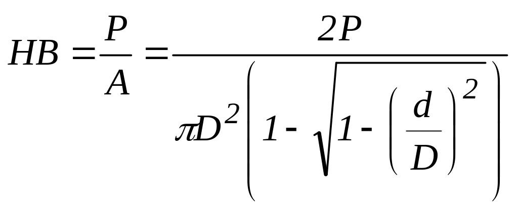 вдавливания в поверхность материала твердосплавного шарика диаметром D под действием нагрузки Р. После снятия нагрузки измеряется диаметр отпечатка d (рис. 1, а) и по табл. 1 определяется число твердости. Число твердости по Бринеллю можно также определить как отношение нагрузки Р к площади поверхности сферического отпечатка А: