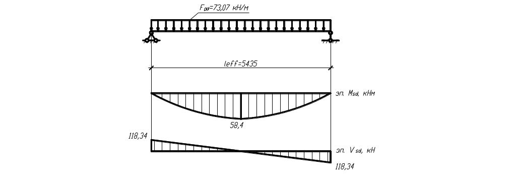 Ригель рассматриваем как свободно опёртую балку с максимальным моментом в середине пролёта, опорами для которой служат колонны, а крайними – стены. При расчёте делаем два сечения: по длине ригеля в зоне максимального момента и на опоре в зоне подрезки.