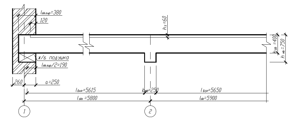 Второстепенная балка работает совместно с прилегающими к ней участками плиты, т.е. расчетное сечение будет тавровое с шириной полки в сжатой зоне, равной расстоянию между осями второстепенных балок, т.е. beff = ls = 2250 мм.