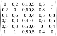 Элементы матрицы Бт.б. имеют размерность в километрах, для удобства расчетов эту матрицу следует привести к нормированному виду, представив aт.з.ik в долях единицы. Для этого все значения aт.з.ik надо разделить на максимальное значение удаленности подразделений ат.б.16=ат.б.26=ат.б.61=ат.б.62=10 км. В результате образуется нормированная матрица