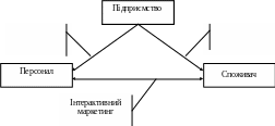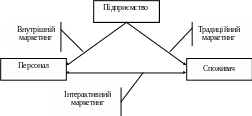 Американський науковець Ф. Котлер зробив неоціненний вклад у вивчення маркетингу послуг – розробив «трикутну» модель (рис. 4). Дослідивши внутрішні комунікаційні процеси та концепцію маркетингу відносин, він запропонував розрізняти три взаємозалежні одиниці в маркетингу послуг: