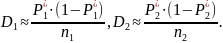 При достаточно больших n1 и n2 каждая из случайных величин P1* и P2*распределена практически нормально, с одним и тем же математическим ожиданием m= P ≈ P* . Что касается дисперсий D1 и D2 в первой и во второй сериях, то они различны и равны соответственно: