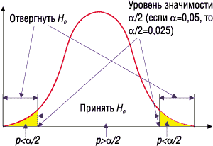 двусторонней: P(K<Kкр) = α /2 и P(K>Kкр) = α /2.