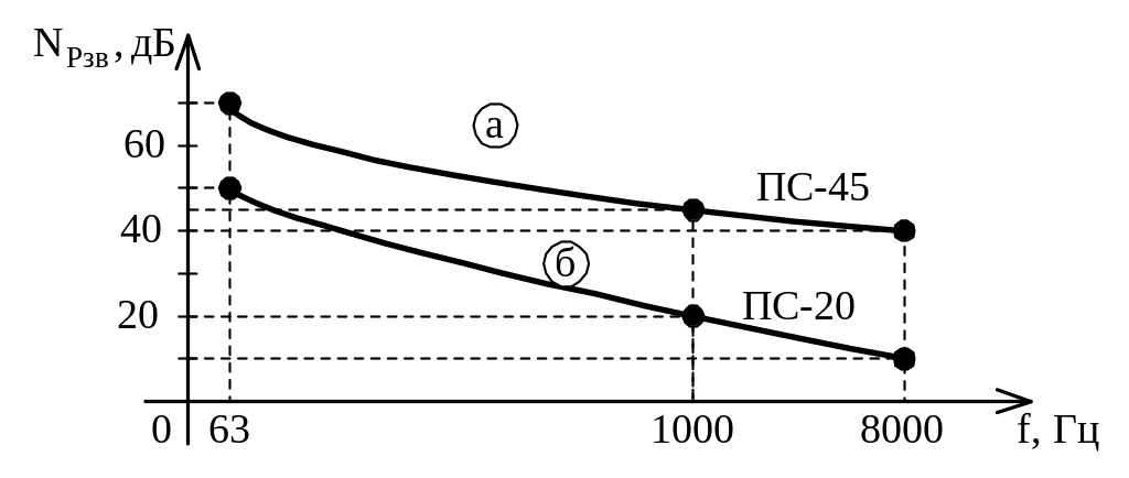 Например, «ПС-45» означает, что допустимый уровень звукового давления для помещения конструкторского бюро на частоте 1000 Гц не должен превышать с определенной точностью 45 дБ.