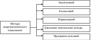 У практиці макроекономічного планування найчастіше використовують такі методи: аналітичний (метод системного аналізу); балансовий; нормативний; економіко-математичні методи; програмно-цільовий і програмно-ресурсний.