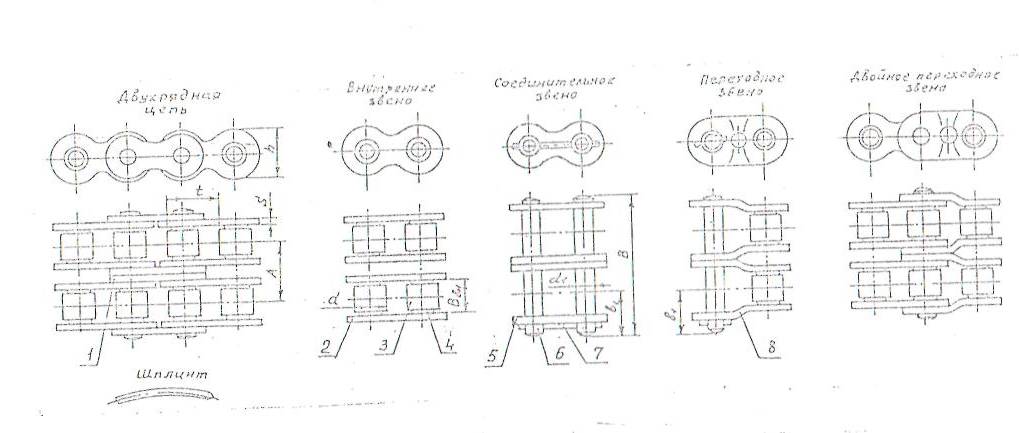 Шынжыр – тізбектей жалғанған үзбелерден тұратын иілгіш металл құрылымды білдіреді. Құрылымдық белгілері бойынша қозғалтқыштық шынжырлар (8.1-сурет) төлкешік-доңғалақтарға жатады және ішкі үзбелерден тұрады. Біріктіруші үзбе кішкене білікке (6) клинтпен (5) сығымдалған екі тіліммен (5) жиналады. Ішкі үзбе ішіне төлке (4) ұстатылған екі тіліммен (2) тұрады. Төлке-тілім біріктірмесінде тартылыстардың төменгі шегі 0,075-0,080 мм, жоғарғысы 0,14-0,15 мм құрайды. Төлкеде доңғалақтар (3) бар, олар жұлдызшамен ілінісе берген кезде төлкеге қатысты бұралады. Осының себебінен үйкеліс азаяды және жұлдызша тістерінің және доңғалақтардың түйіспелерінің беттерінің тозуы төмендейді. Сыртқы (5)және ішкі (2) тілімдер сегіздікке ұқсас болып келеді. Үлкен жүктемелер мен жылдамдықтардан БҚ–да орта тілімдер (5) аралық тілімдерге (1) ауыстырылған көп қатарлы шынжырлар кең қолданылады. Үзбелер саны тақ болса, шынжыр өтпелі тілімдерден (8), кішкене біліктен, доңғалақтардан тұратын өтпелі үзбелермен біріктіріледі. Ол шынжырға жіңішке аяғымен және оның қозғалу бағытына қарай қойылады.