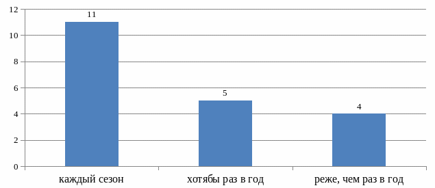 11 человек охотятся каждый сезон, 5 человек охотятся хотя бы раз в год, 4 человека – реже раза в год.