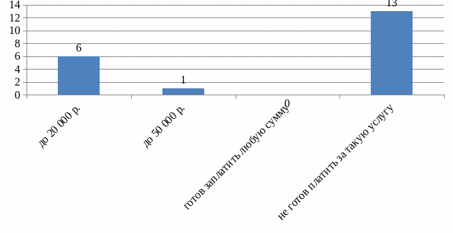 Из числа опрошенных 13 человек не готовы платить за подобные услуги. Тем не менее, 6 человек готовы воспользоваться услугой организованного охотничьего тура при ее стоимости до 20 000 р., и один, при стоимости до 50 000 р.