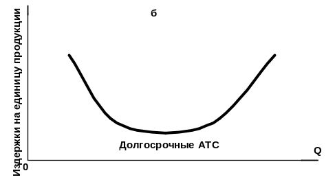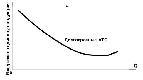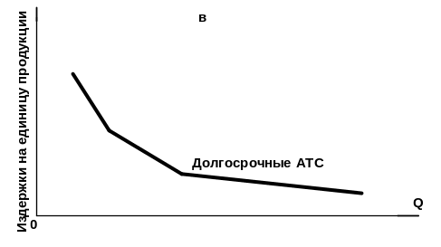 Из рис. 48.в видно, что кривая долгосрочных ATC сначала стремительно падает, затем темп падения замедляется, и она плавно снижается с увеличением объёма выпуска. Средние издержки приближаются к постоянным.
