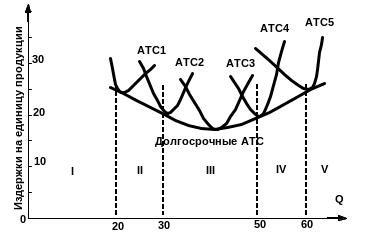 Долгосрочный период - такой временной отрезок, в течение которого фирма в состоянии изменить количество всех используемых ресурсов, включая и производственные мощности. В то же время этот период по своей продолжительности должен быть достаточен для того, чтобы одни фирмы смогли покинуть данную отрасль, а другие, наоборот, войти в неё.Так как в долгосрочном периоде переменный характер всех применяемых факторов позволяет фирме использовать самые оптимальные варианты их сочетания, то это непременно отразится на величине и динамике изменения её средних издержек. При увеличении объёмов производства, необходимо расширение мощностей. При этом средние общие издержки на начальном этапе расширения производства будут снижаться, а затем, когда в производство будут вовлекаться всё новые и новые мощности, станут возрастать. Для объяснения такой закономерности рассмотрим особенности построения кривой долгосрочных средних общих затрат ATC, или так называемой плановой кривой. На рис. 46 представлены пять различных вариантов (I-V) размеров предприятия, рассчитанных на производство различных объёмов продукции при наименьших средних издержках ATC. Эти варианты фирма может рассматривать как ступени своего роста. На каких-то промежутках (ступенях) своей деятельности она не меняет своих производственных мощностей, а использует то, что имеется, т.е. можно полагать, что на каждой ступени фирма функционирует в краткосрочном периоде. Поэтому кривая, описывающая её издержки на данном этапе, будет кривой краткосрочных средних общих издержек.