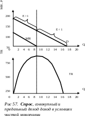 На (рис. 57.) продемонстрирована взаимосвязь спроса, совокупного дохода и предельного дохода в условиях чистой монополии. Совокупный доход равен произведению цены на объем выпуска в каждой точке кривой спроса TR = P×Q.