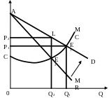 Оптимальный выпуск монополии находится в точке E1 . При пересечении кривых MC и MR он составляет Q2 при цене P2.